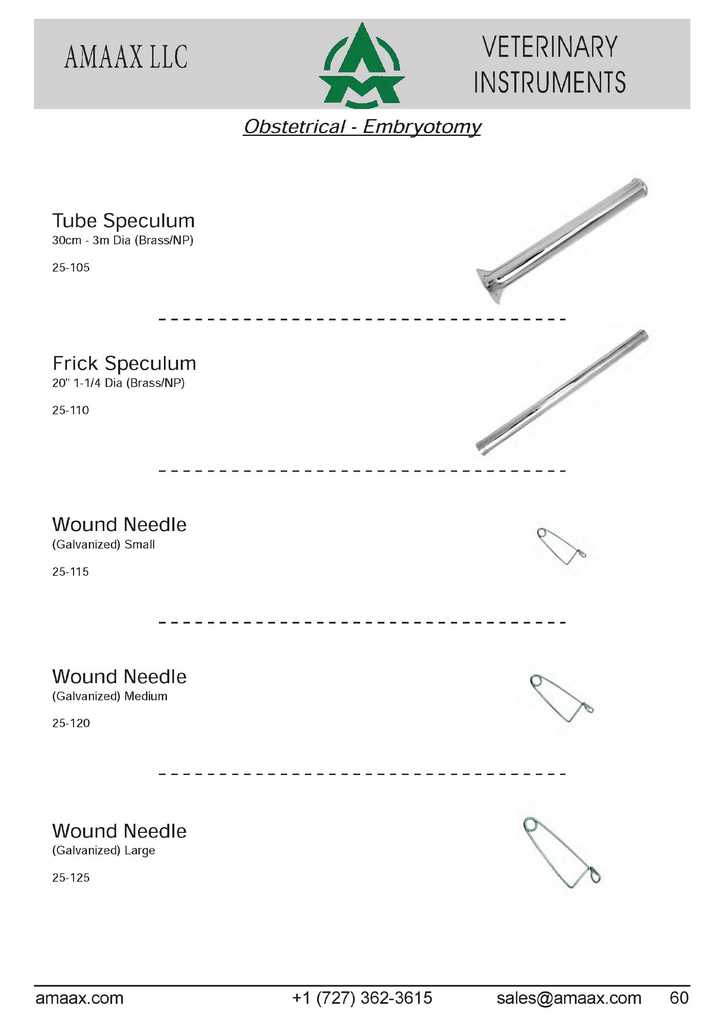 Obstetrical -Embryotomy Tube Speculum 30cm -3m Dia (Brass/NP) 25-105 Frick Speculum 20″ 1-1/4 Dia (Brass/NP) 25-110 Wound Needle (Galvanized) Small 25-115 Wound Needle (Galvanized) Medium 25-120 Wound Needle (Galvanized) Large 25-125
